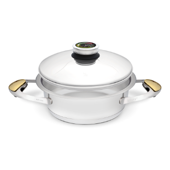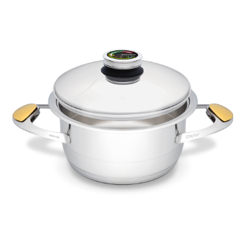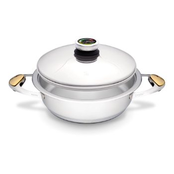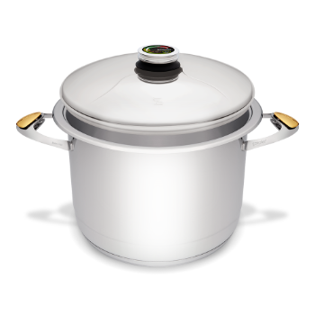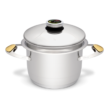 Patented Accuthermal Compact Bottom, the heart of Zepter’s method for preparing healthy food and responsible for saving up to 70% on energy consumption, is joined to the body of the pot by a machine that exerts a pressure of up to 2,000 tons (with no gluing or soldering), making the bottom indestructible and compact. Finally, Zepter’s Radio Digital Thermocontrol enables a completely automated cooking process from beginning to end.